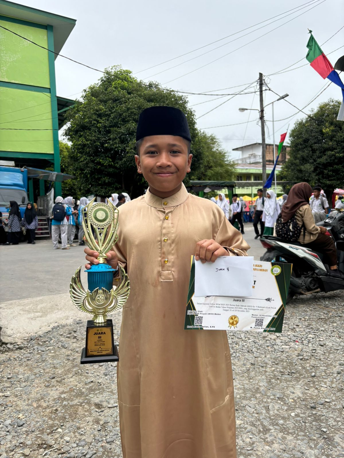 Medan, 2025 — Prestasi membanggakan kembali diraih oleh salah satu santri SMP IT Darul Azhariyun. Rizqi Ahza Ramadhan, santri kelas VIII, sukses meraih Juara III pada lomba Da’i Tingkat SMP yang diselenggarakan oleh GEMI (Gebyar Milad KKD) di Mas Proyek UNIVA Medan.